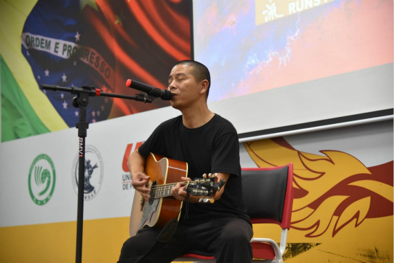 3月5日晚,中国著名民族摇滚歌手苏阳来到巴西伯南布哥大学孔子学院,分享他的音乐创作历程——“黄河今流”。中国驻累西腓副总领事尚思远,伯南布哥大学副校长Maria Tereza Cartaxo Muniz,伯南布哥联邦大学亚洲学院院长Marcos Costa Lima,孔子学院中方院长王洪亮,巴方院长Heldio Villar,孔子学院师生以及当地民众参加了此次活动,一同感受民族摇滚的魅力。